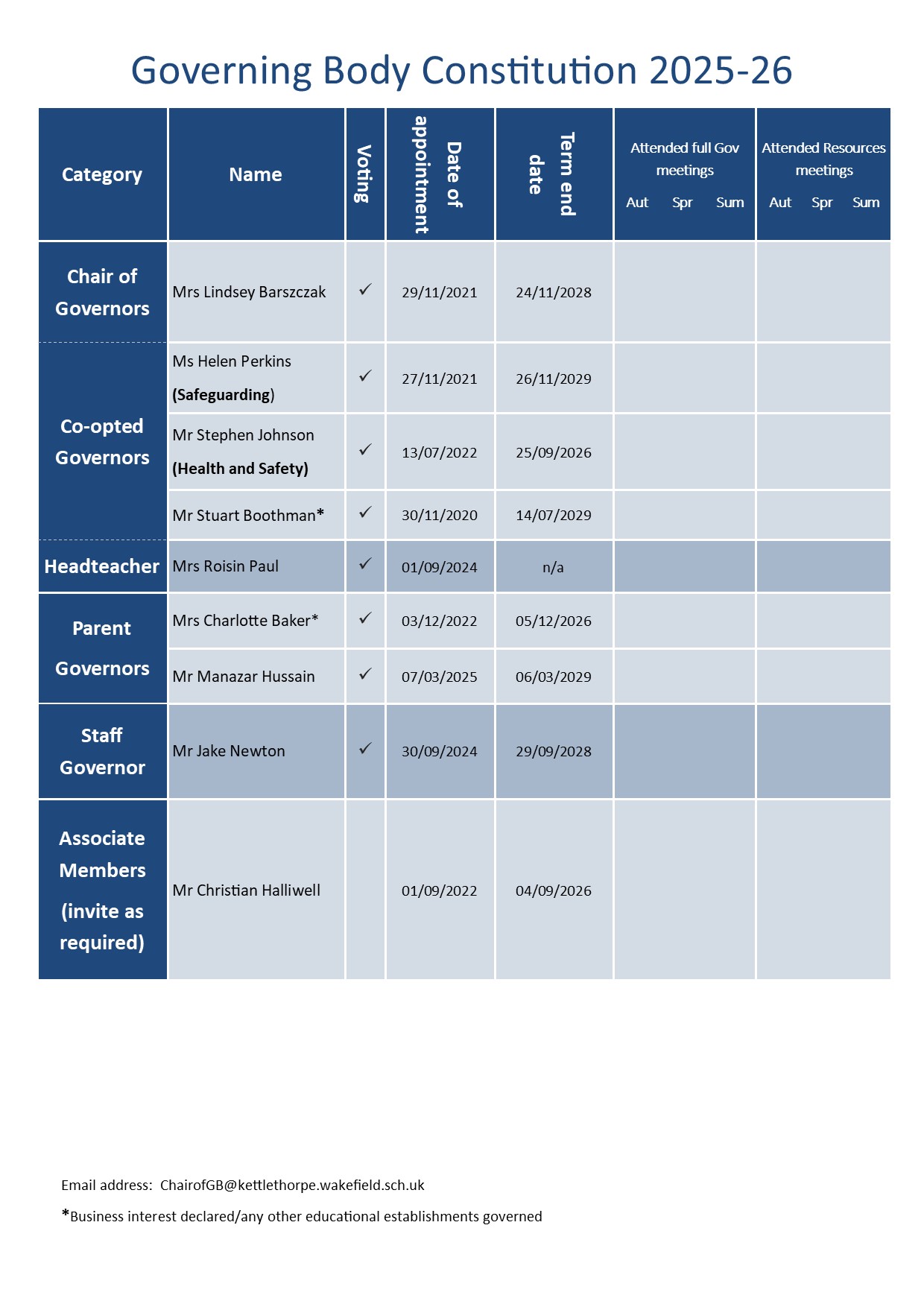 The Governing Body, along with its Resources Committee, meet as a whole regularly to discuss termly and annual standing items. All policies are agreed through the Body. The meetings are formally minuted.